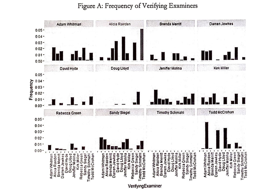 Above, Figure A: Frequency of Verifying Examiner, shows the visual summation of each examiner's verification of other examiner's work. While the frequency of involvement in verification among different examiners exists, there is no discernable pattern to be interpreted through the given data.