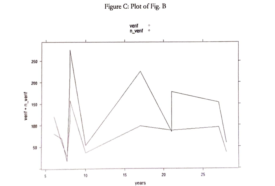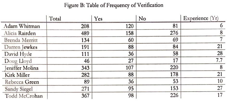 Figure B: Table of Frequency of Verification of Figure C seems to carry the observation from Figure A. Not only is there a lack of discernable pattern in the evaluation between two examiners, but the rate of verification also seems to only depend on the individual regardless of experience - perhaps due to variability in cases.