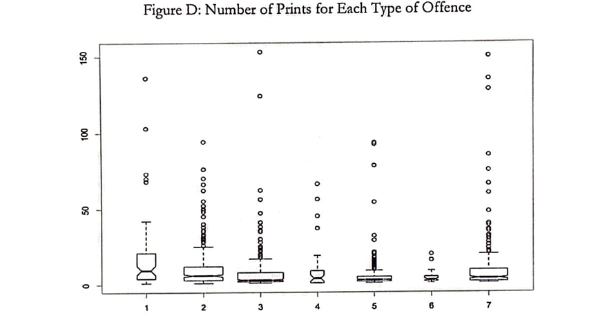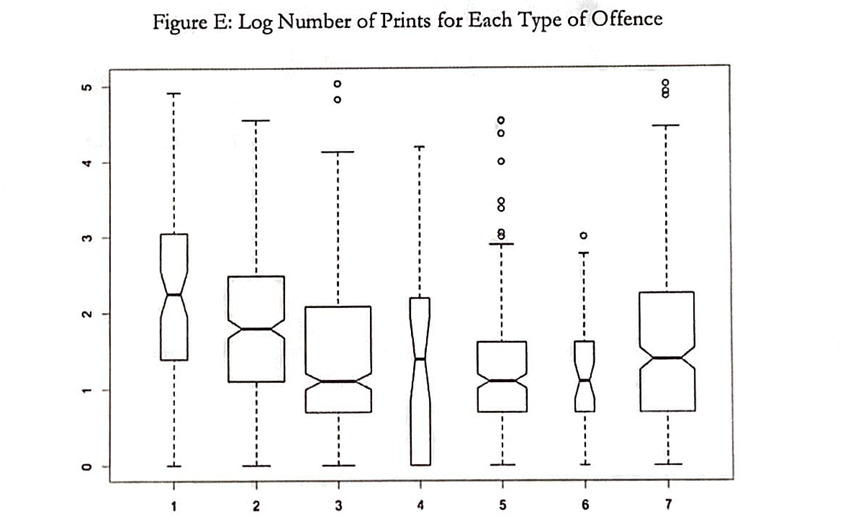 Examination of the number of prints collected per type of crime (Using "Offense7", where crime is sorted into top 7 frequent categories), reveals a weak discernment. The boxplot of the number of prints for each type of major offense suggests that while Thefts carry a higher number of latent prints in general, the use of a log of the number of prints supports the need for additional statistical evidence that is not present.