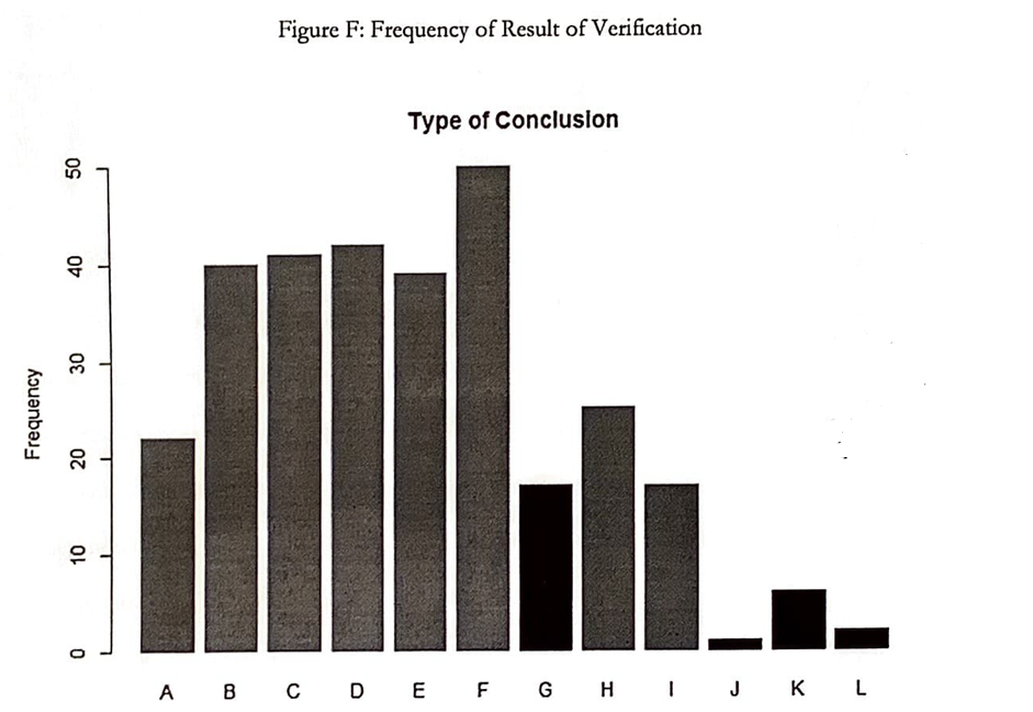 Figure F displays a graph of which decision is held after verification, with A through F being the verifier's conclusion and G through L being the analyst's conclusion. Visually, the two distributions appear to have a drastically different conclusion. A simple t-test supports this visual analysis, with a p-value of 0.000871, well below the pre-specified alpha value of 0.005, rejecting the null hypothesis that there is no difference between the verifier's conclusion and the analyst's conclusion. However, the fact that two events are not independent should be accounted for.