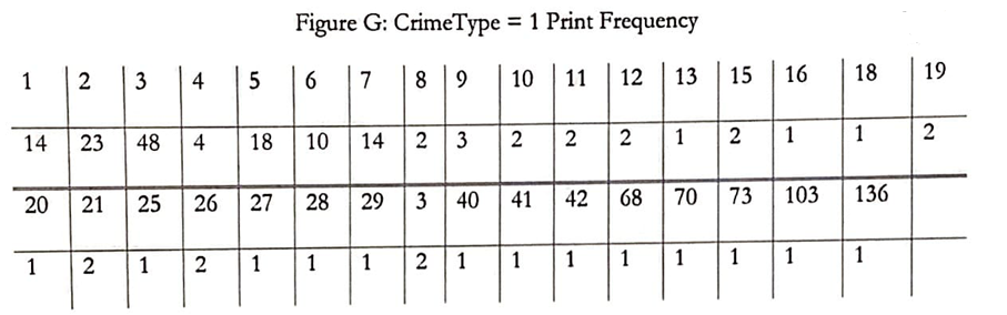 The frequency of prints, for example with Figure G: CrimeType = 1 case table below, suggests a possible Poisson distribution. However, even if such a pattern did prevail, it would serve little purpose in supporting the accuracy of the conclusion by examiners.
