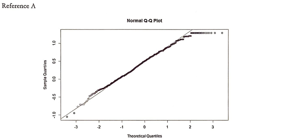 The questions that inquired the individual's personal stance on the reliability of the fingerprint evidence were used to create an aggregated normalized score. Reference A, the QQplot of the scores, was used to check the normality of the scores. As expected, the QQPlot follows a straight line, proving the normal distribution. Similarly, the histogram of average perceived reliability (Reference B) was plotted to visualize the spread of the perceived reliability scores.