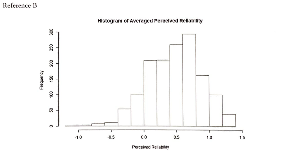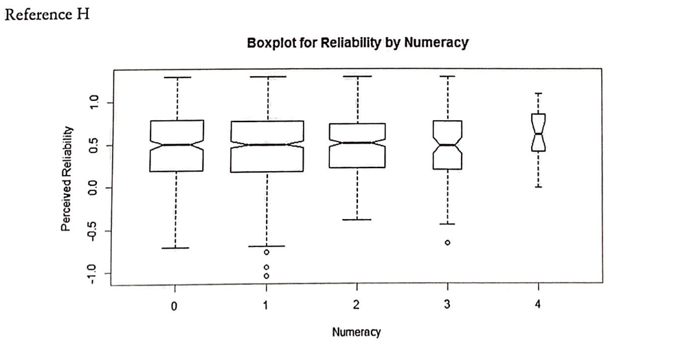 Numeracy, found in Reference H, did not impact the perceived reliability. However, note that this simply means that the hypothesis that states that numeracy did indeed impact the reliability scores could not be supported with the given data. It does not indicate that numeracy has no impact on the reliability scores. To prove the effect of numeracy (or lack thereof), a more thorough and focused study is recommended.