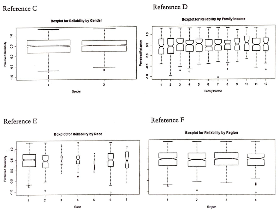 Following references, Reference C through F, display boxplot concerning the effects of Gender, Family Income, Region, and Race on Perceived Reliability. As can be observed, it is difficult to assume that the variables presenced in Reference C through F are significant. An interesting observation to note is that the Family Income plot (Reference D) shows relatively consistent population distribution among all income levels, which is not representative of the actual population of the United States.