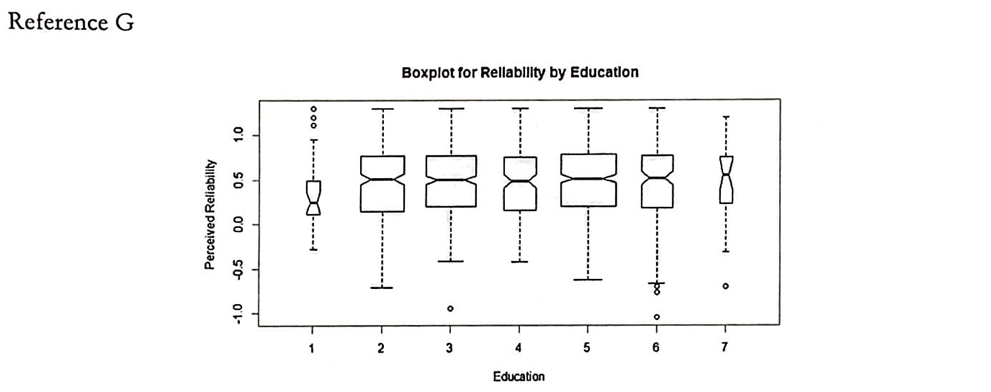 Boxplot of Reliability of Education (Reference G) displays a significant difference between Group 1 (less than high school level education) and Group 2 through 7, which have higher levels of education in increasing order. However, considering the likelihood of individuals with less than high school level education serving as a juror along with the low frequency of the sample (26 out of 1448 individuals that responded to the question), it is difficult to say that the results found in the plot are statistically significant.