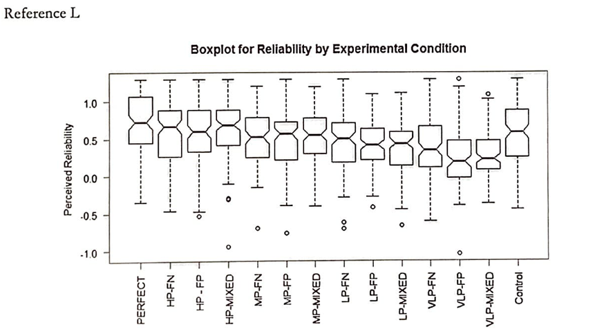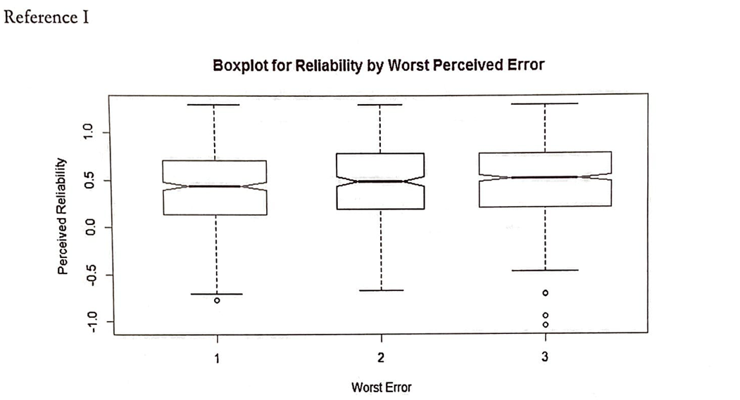 The Boxplot for Reliability by Worst Perceived Error (Reference I) shows that the juror's view on whether the false positive or false negative errors (or neither) are worse does not impact the perceived reliability scores.