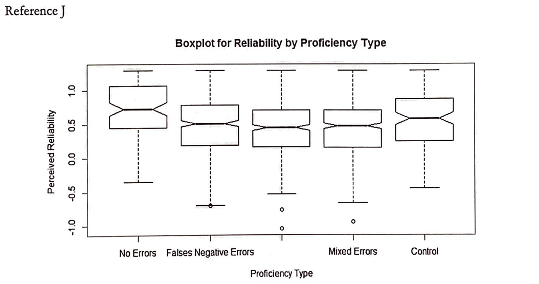 The reliability scores from all examiner proficiency levels were combined under their respective proficiency types - False Positive, False Negative, and Mixed- along with scores from the Perfect (No Error) and Control conditions. The boxplot for the reliability type (Reference J) reveals that, as previously found, there is no significant difference between the three error types. This plot stands to show that public opinion differs greatly from how the judicial system is designed, which weighs false-positive outcomes far worse than false-negative outcomes.