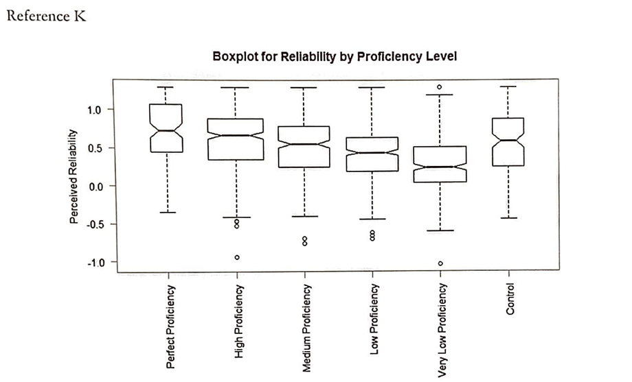 Most significantly, Reference K, the Boxplot for Reliability by Proficiency Level, indicates that there is a significantly different perceived reliability according to the examiner's proficiency level. The general public and thus the jury and less likely to trust the fingerprint evidence if the revealed proficiency of the examiner is low.