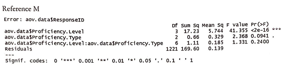 Finally, a One-Way Analysis of Variance (Reference M) was conducted to further support the conclusion found in Reference K. The low p-value of the Proficiency Level, at less than 2e-16, shows that proficiency level is indeed a statistically significant variable.