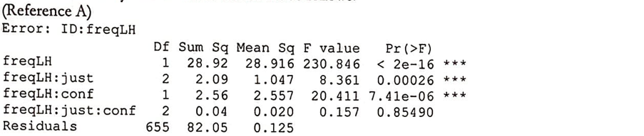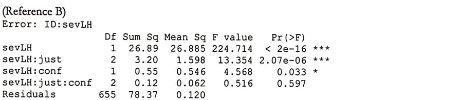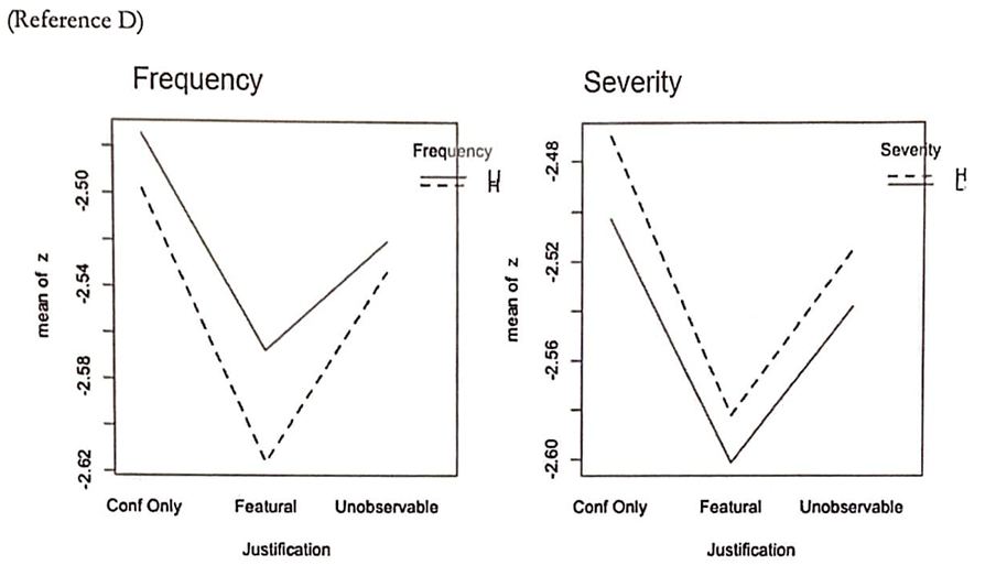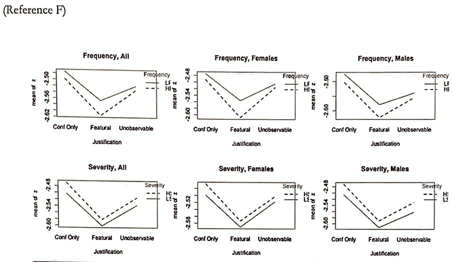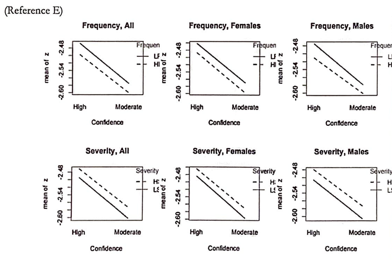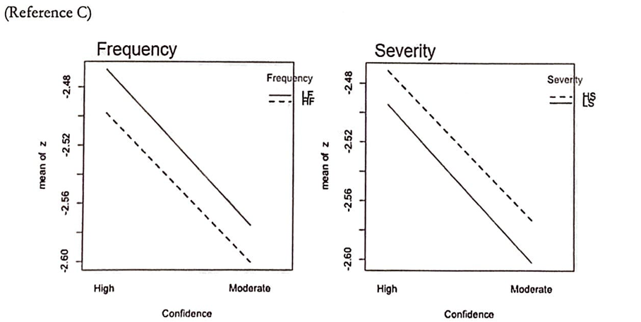 Reference A and B stands to prove that Frequency (Reference A) and Severity (Reference B) has a significant effect on the perception of eyewitness confidence statements. This is further supported by the interaction plots found below.