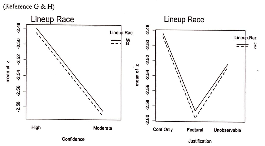 Reference G and H show that while racially white lineup tends to be rated with a higher confidence rate (perhaps due to the supposed familiarity of racially white faces), it is significantly less compared to the difference observed in Reference C and D. Furthermore, the summary of the model on effects of lineup race (Reference I) found below states that the relationship between the race of the lineup and the perceived confidence has no statistical significance.