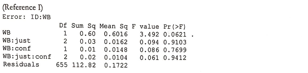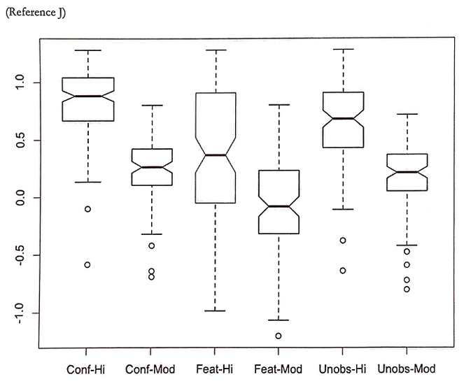 Finally, in Reference J, summation of the effects of Justification [Confidence Only, Featural, Unobservable] and Confidence [High or Medium] are shown through a boxplot of the average of the 8 scores from each person.