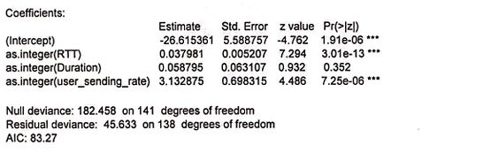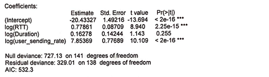 The data was transformed due to the large distance between the variables found during initial plotting. Then, we performed logistic regression on the log of User Flow Loss Rate as a function of the log of RTT, log of Duration, and log of User Send RAte to fit a regression model. [Similar regression without the Duration variable was also performed and returned analogous results.] The results are below.
